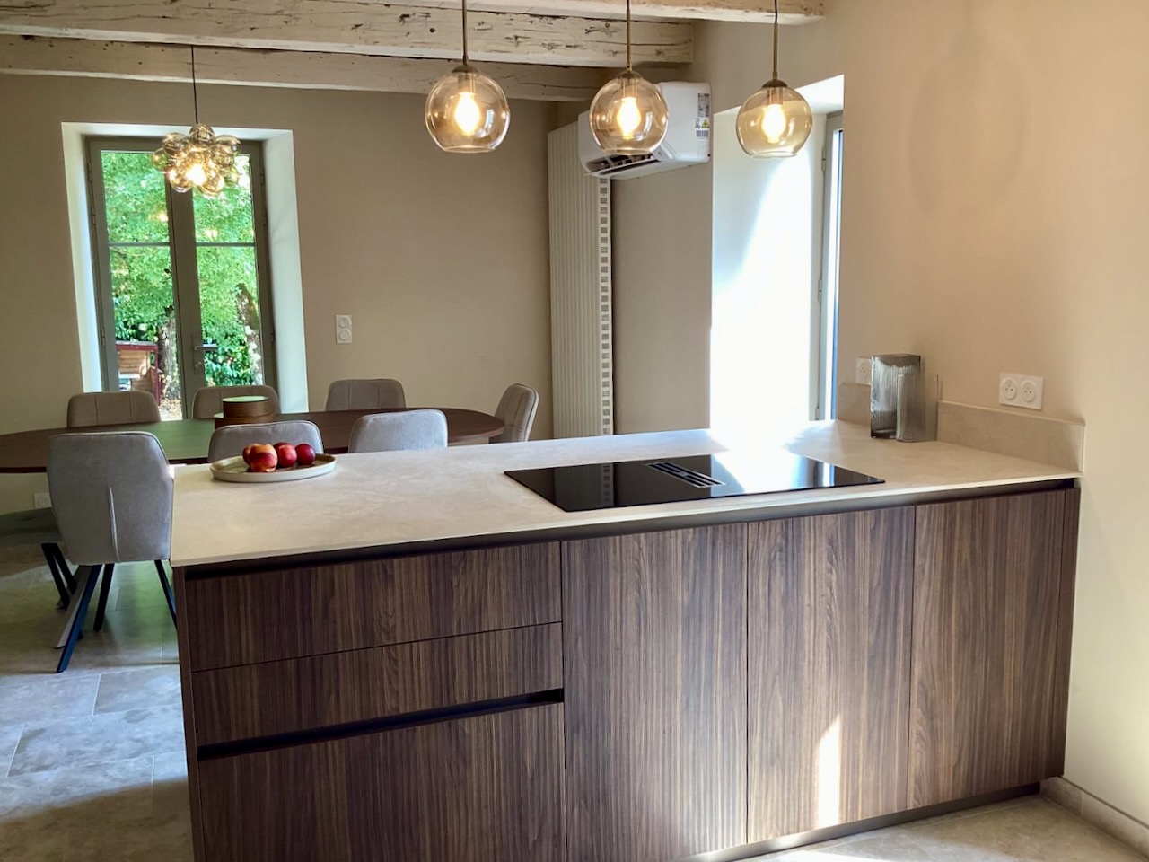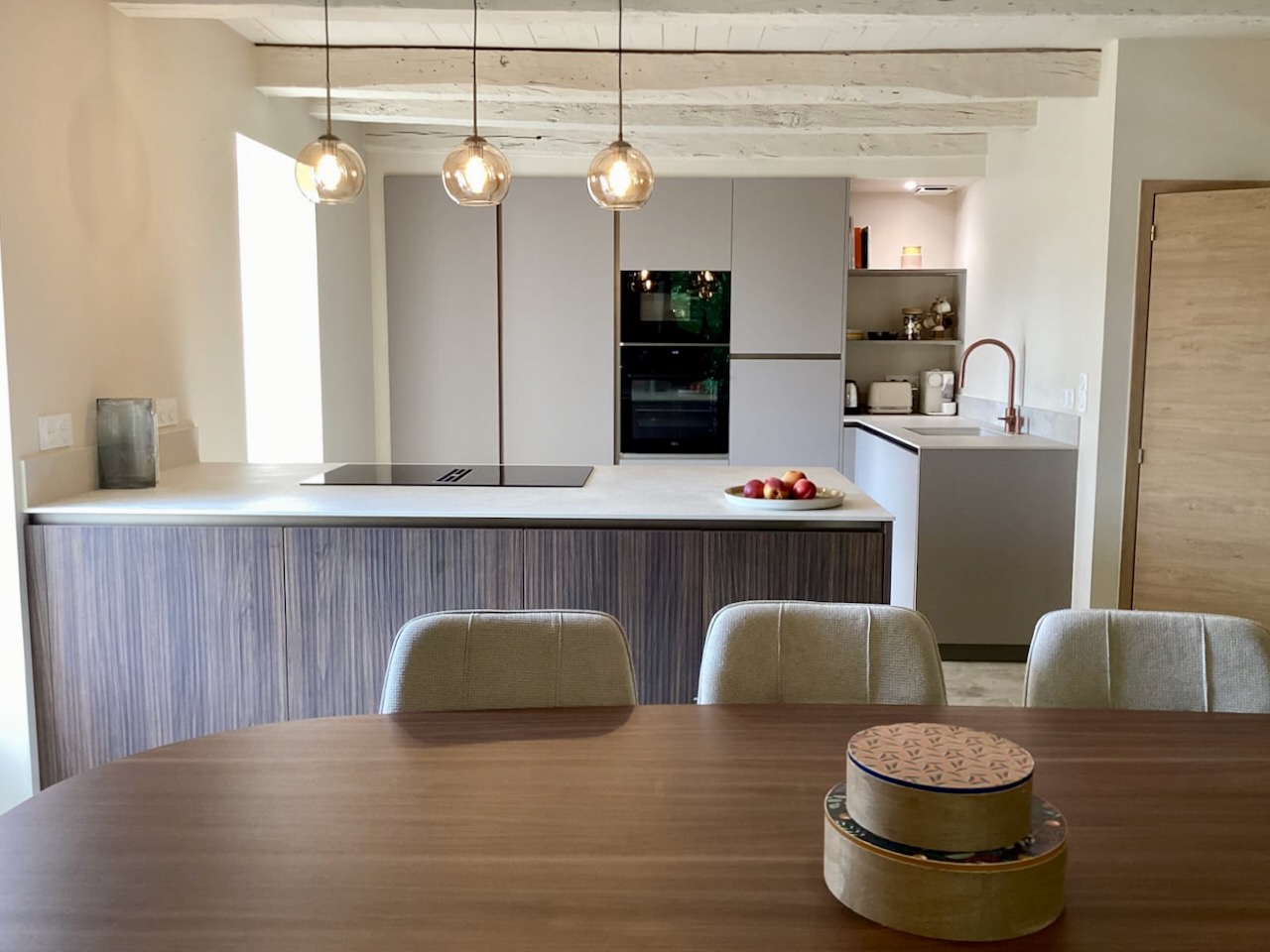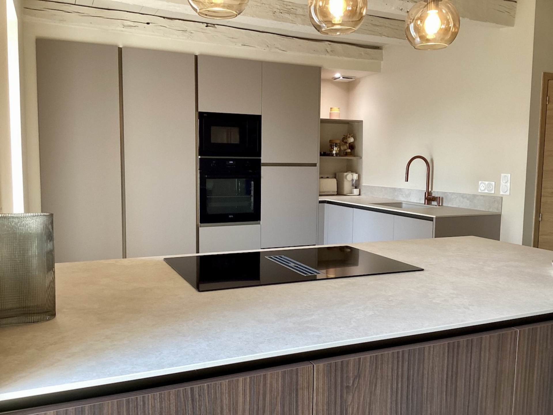 Daisy, conceptrice du magasin Veneta Cucine Cahors, s’est rendue directement chez les clients pour imaginer une cuisine sur mesure, en parfaite harmonie avec le charme ancien de la bâtisse et leur envie d’un espace de vie ouvert et convivial.