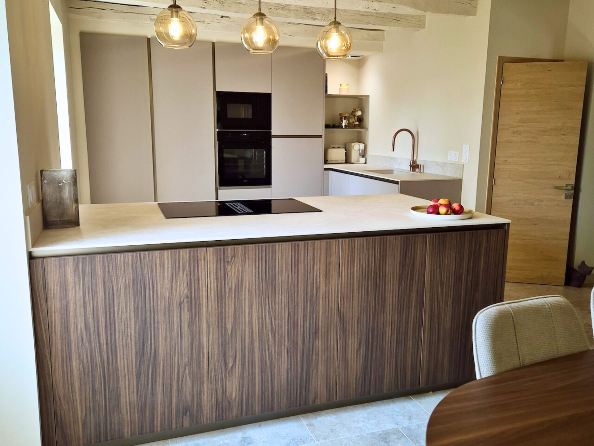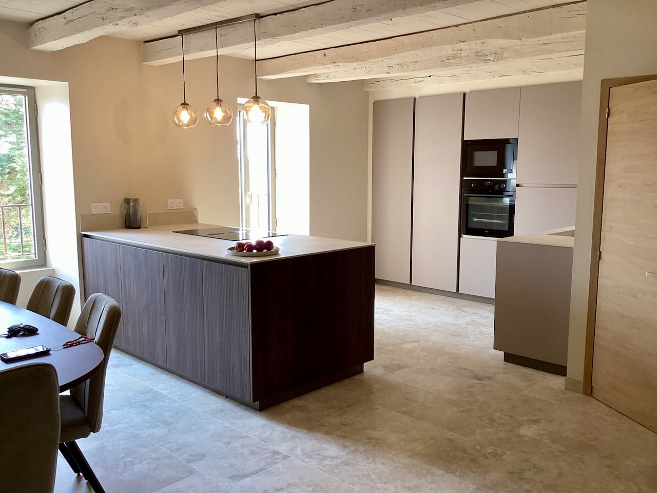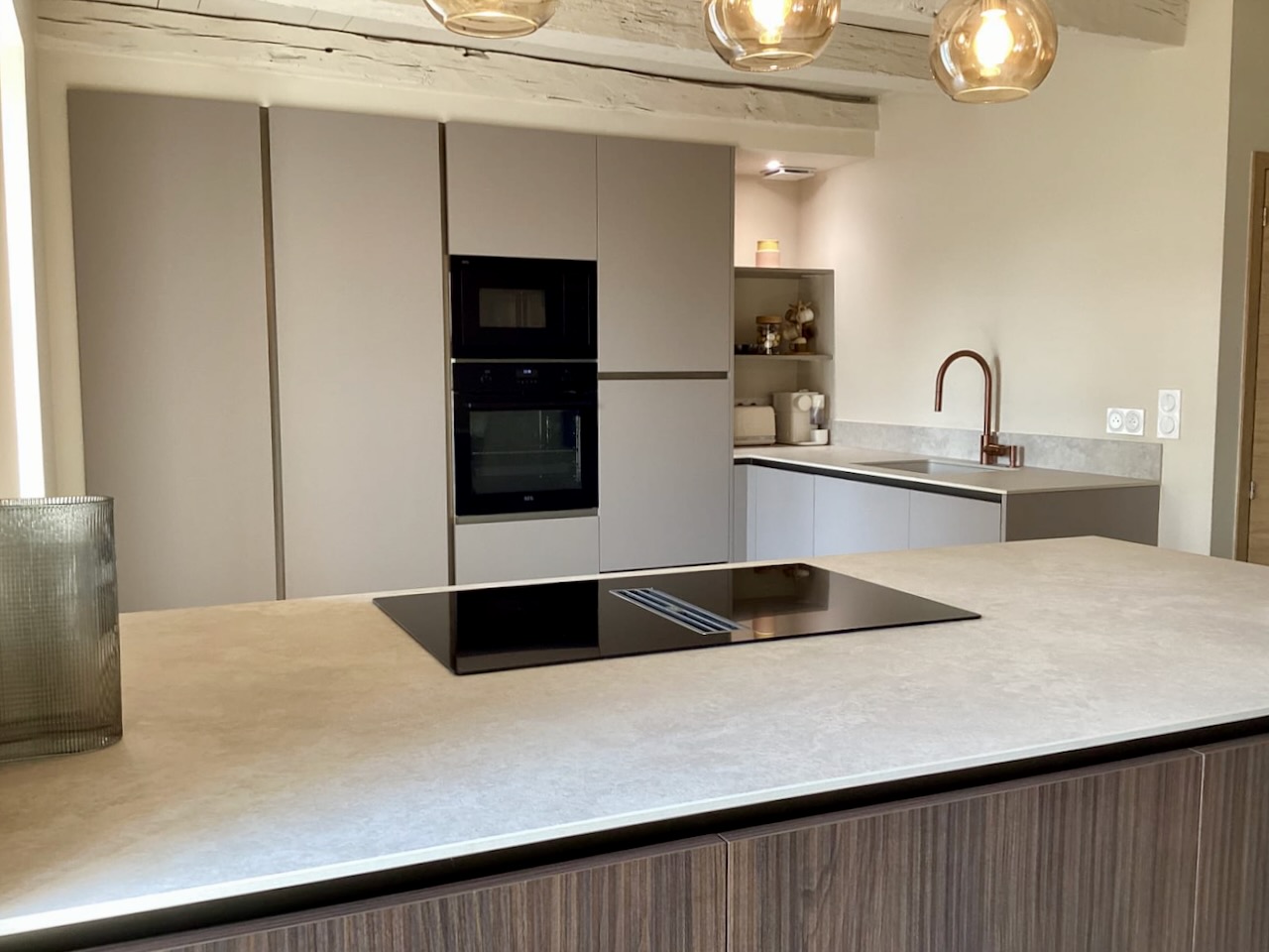Daisy, conceptrice du magasin Veneta Cucine Cahors, s’est rendue directement chez les clients pour imaginer une cuisine sur mesure, en parfaite harmonie avec le charme ancien de la bâtisse et leur envie d’un espace de vie ouvert et convivial.