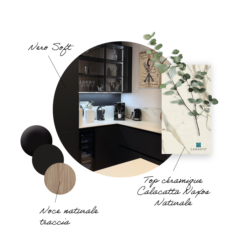 L’implantation initiale a été entièrement repensée afin de mieux s’adapter à l’espace et à nos usages. Le projet final associe une céramique effet marbre veinée de bronze, des façades Nero Soft et des touches de bois, créant une atmosphère à la fois chic et chaleureuse.