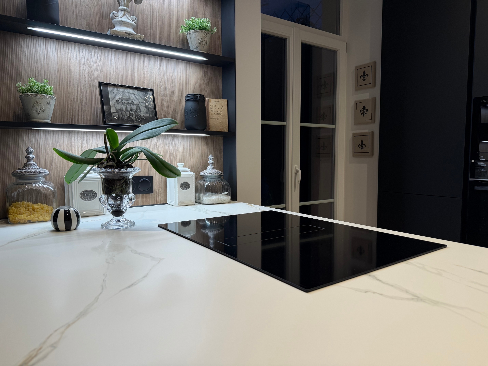 Ce qui rend cette cuisine unique, ce sont tous les détails soigneusement pensés : étagère Stepsystem, vitrine, éclairages, crédences ou encore plaque de cuisson avec hotte intégrée. Chaque élément contribue à un espace entièrement personnalisé, pratique au quotidien et résolument différent d’une cuisine classique. Le plan de travail Caranto Naxos Naturale vient parfaire l’ensemble avec élégance et fonctionnalité.