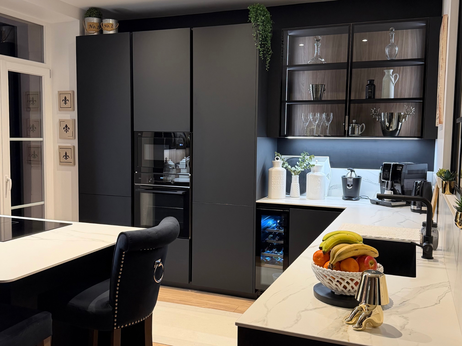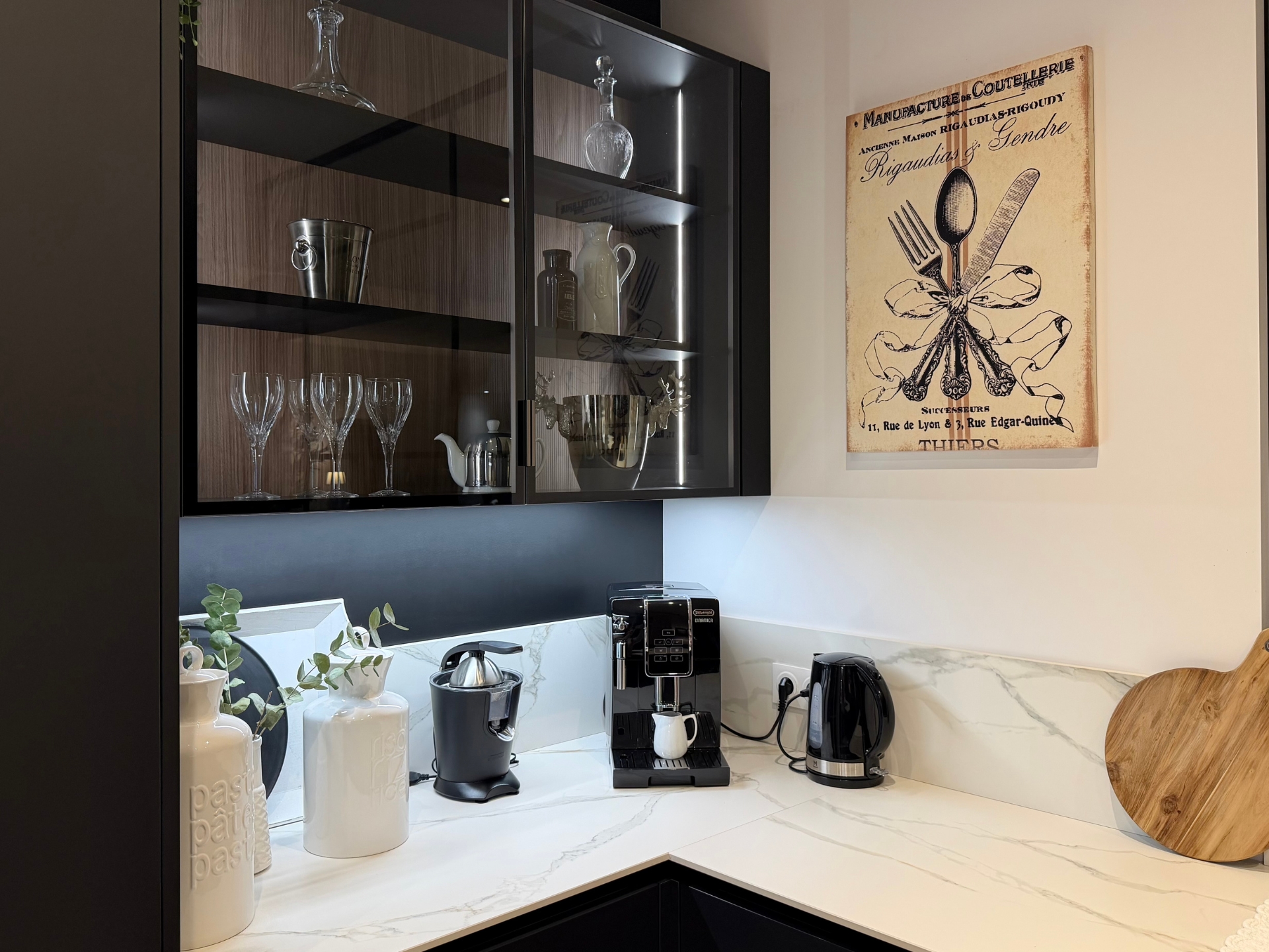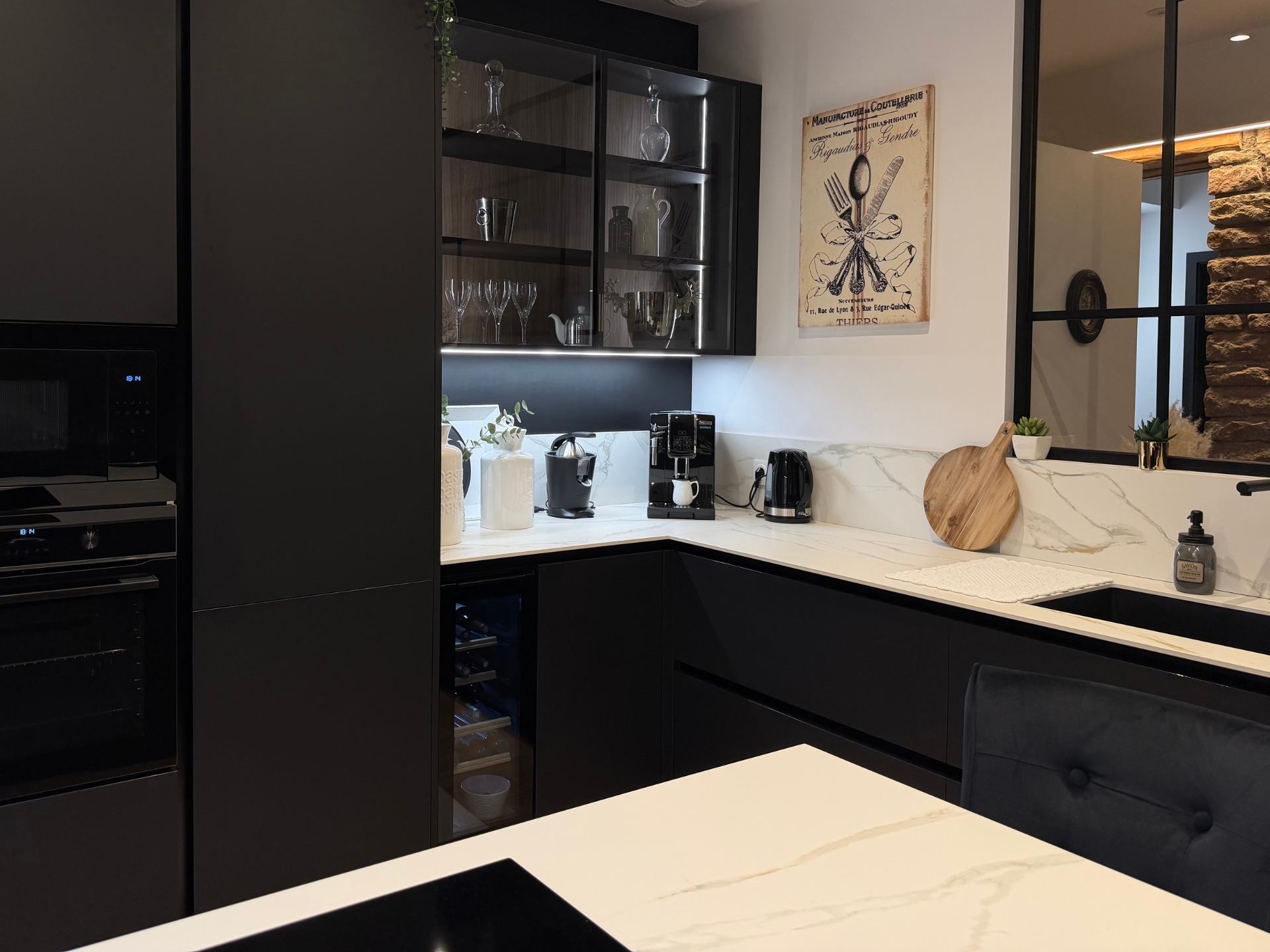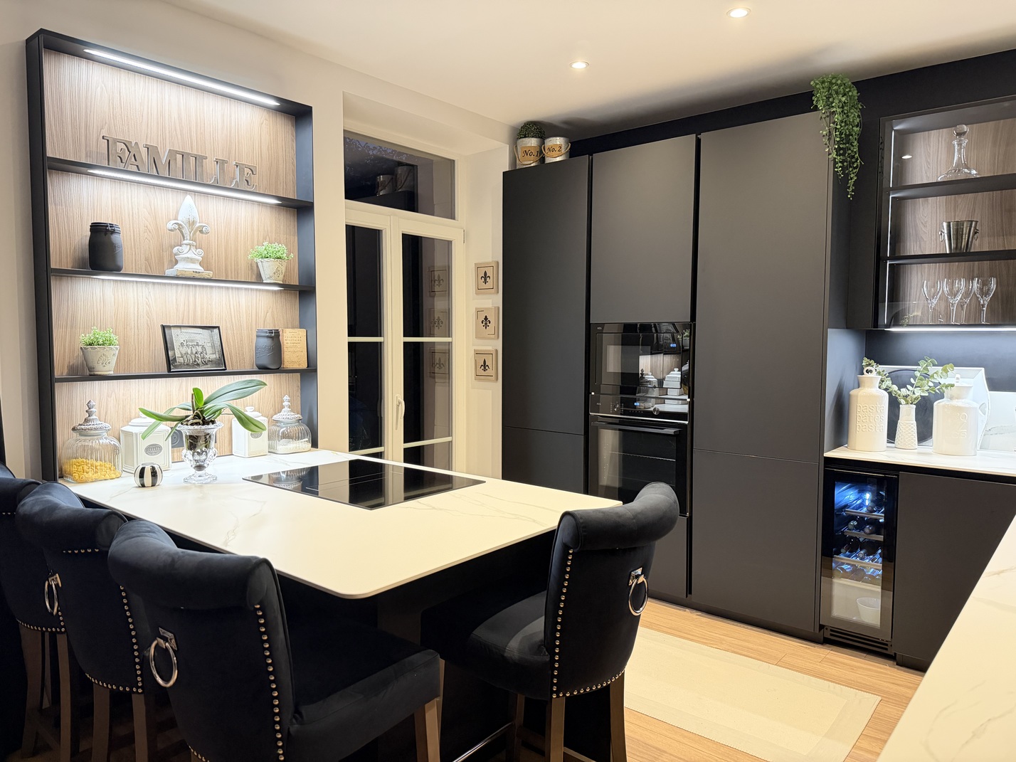 Nous avons découvert Veneta Cucine grâce à un ami travaillant dans l’immobilier et partenaire de Veneta Cucine Épinal. Dès le départ, nous avions une idée très précise de notre future cuisine : façades noires, plans en céramique et sans électroménager intégré, des choix bien définis.