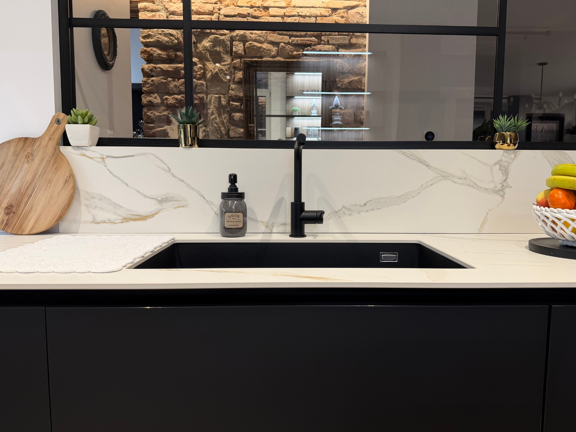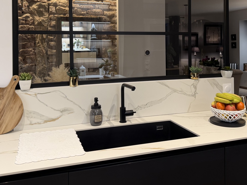 Une crédence en céramique, parfaitement coordonnée au plan de travail, pour une harmonie élégante et sans compromis.