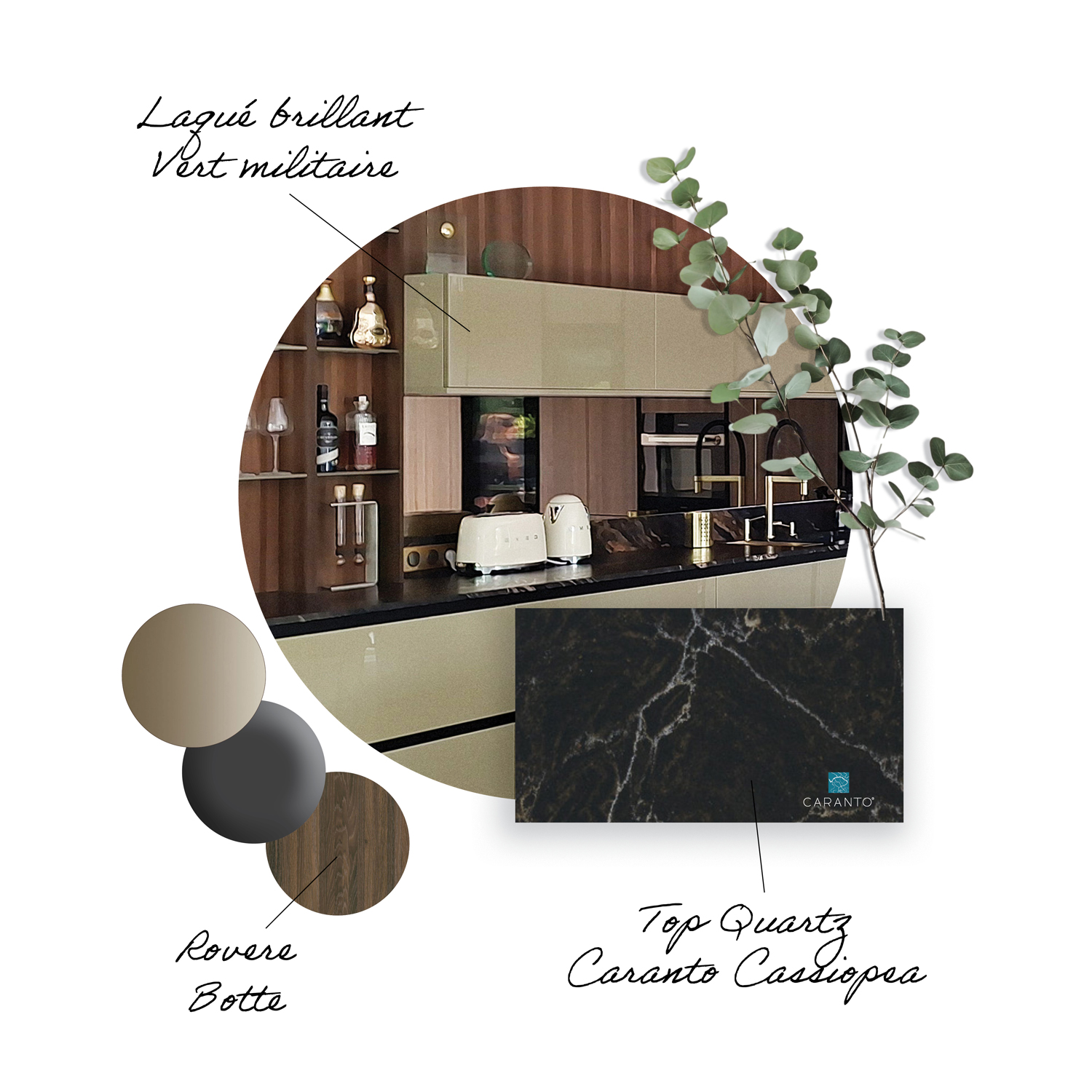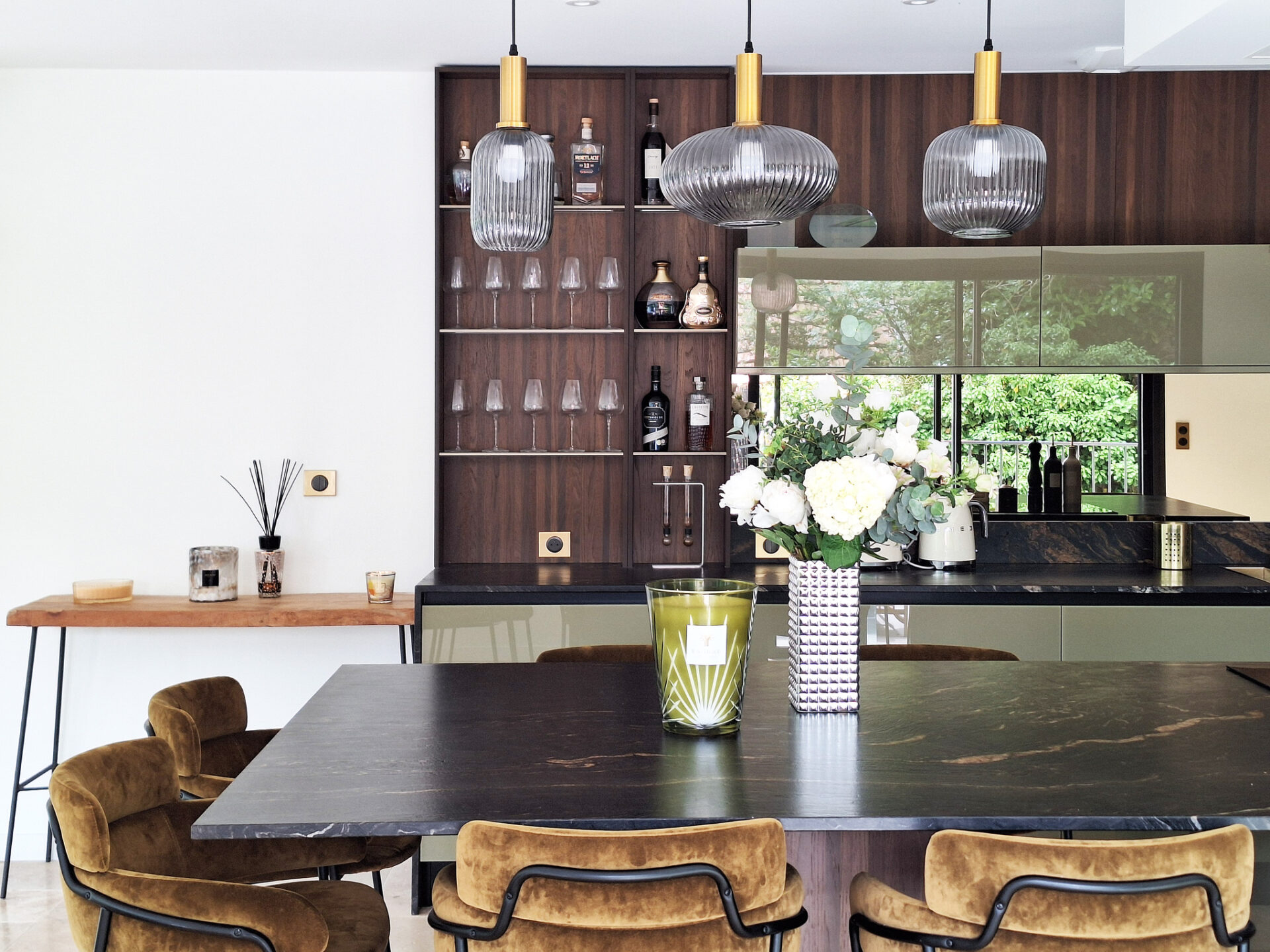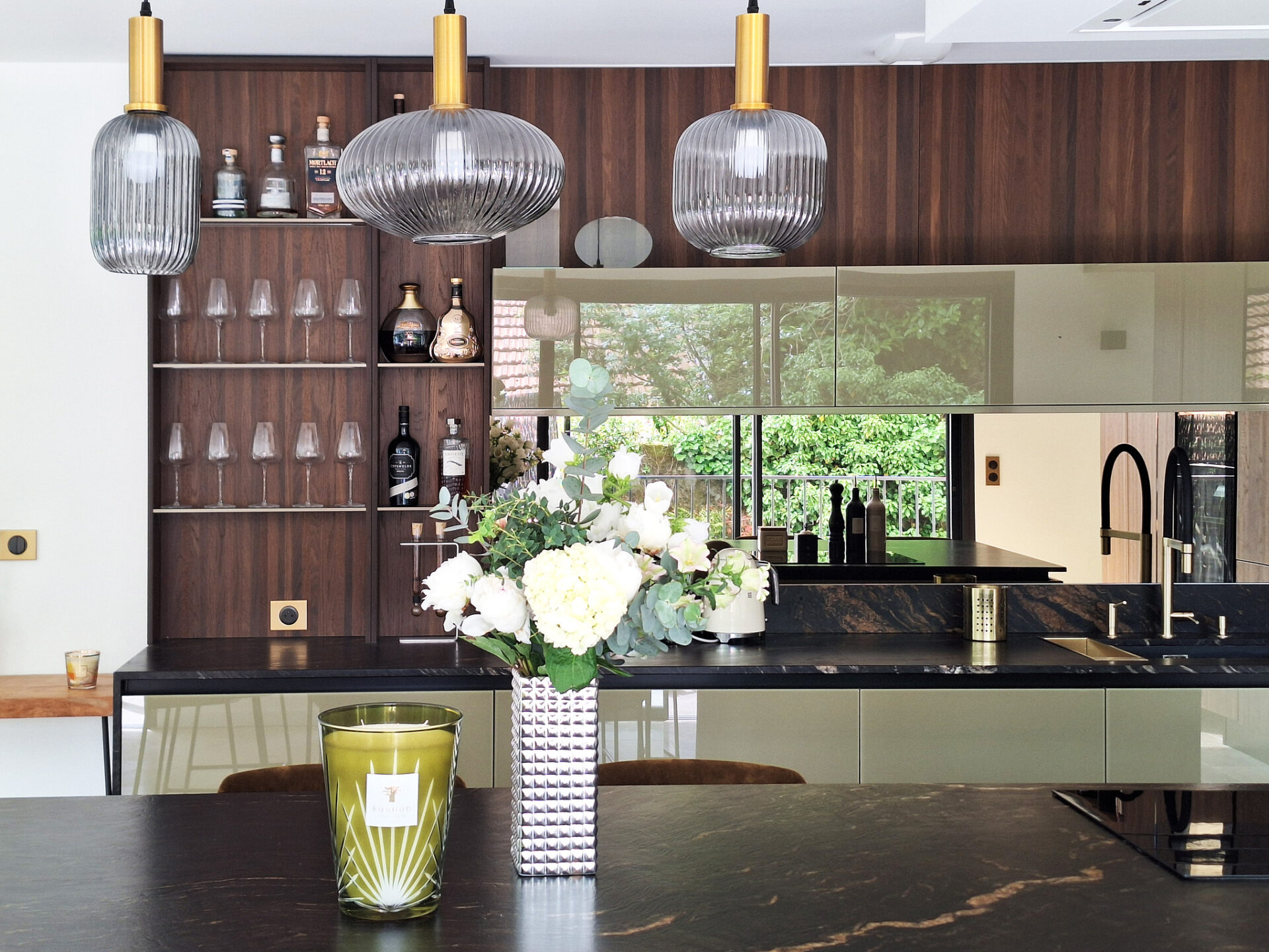 Nous avons sélectionné la gamme d’exception de Veneta Cucine avec ses matériaux rares comme ses façades laquées sans solvant au vert profond combiné aux façades en verre Riflex travaillé pour refléter la lumière combinée au placage bois appelé Rovere Botte mêlant nuances chaudes et accents profonds et naturel.