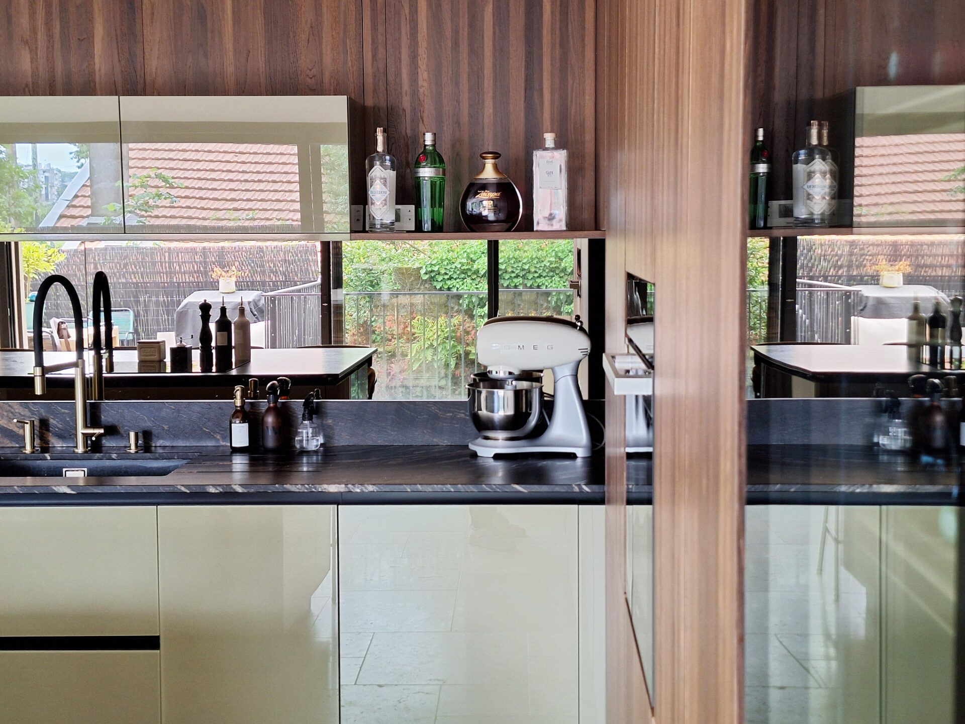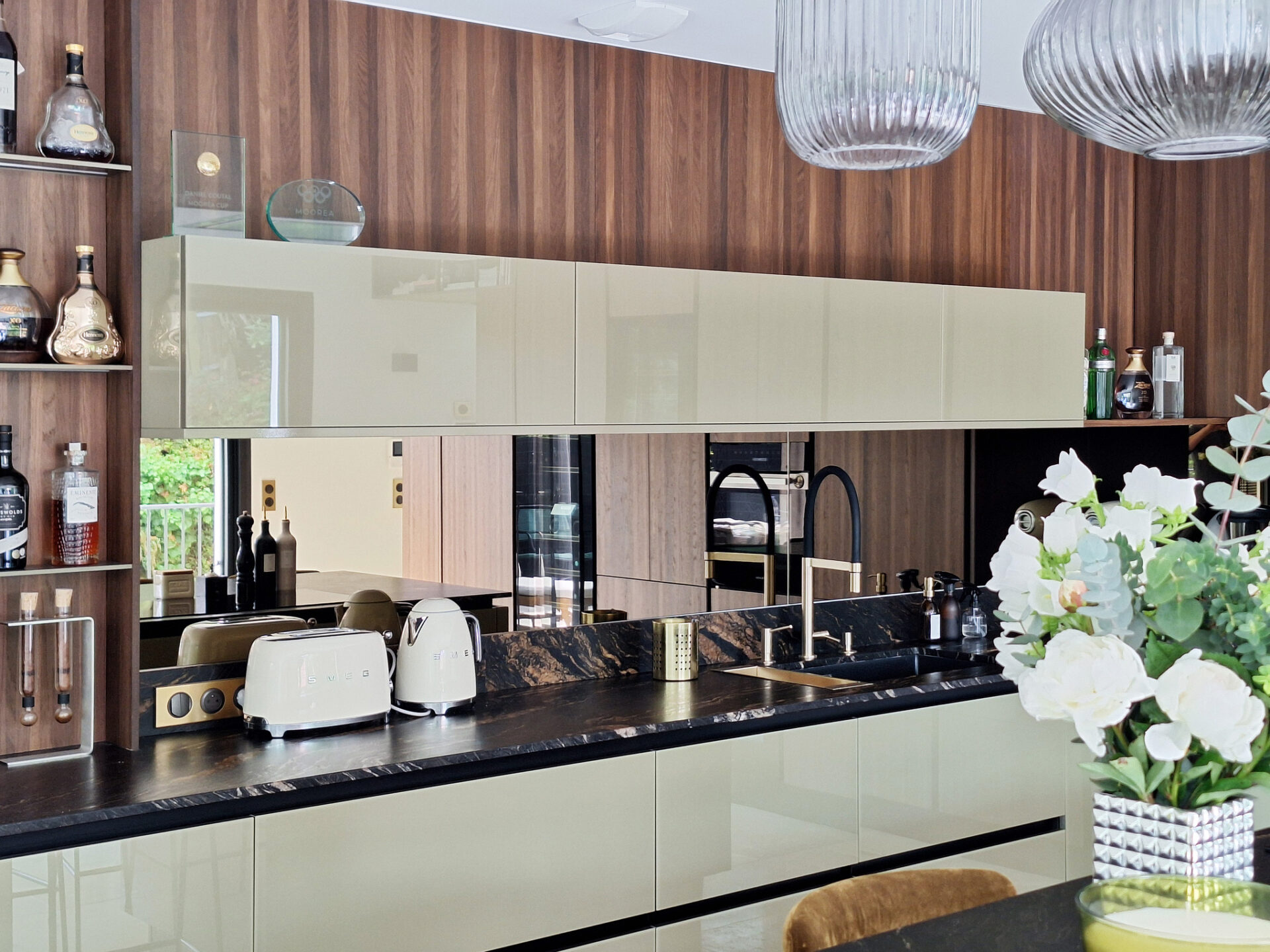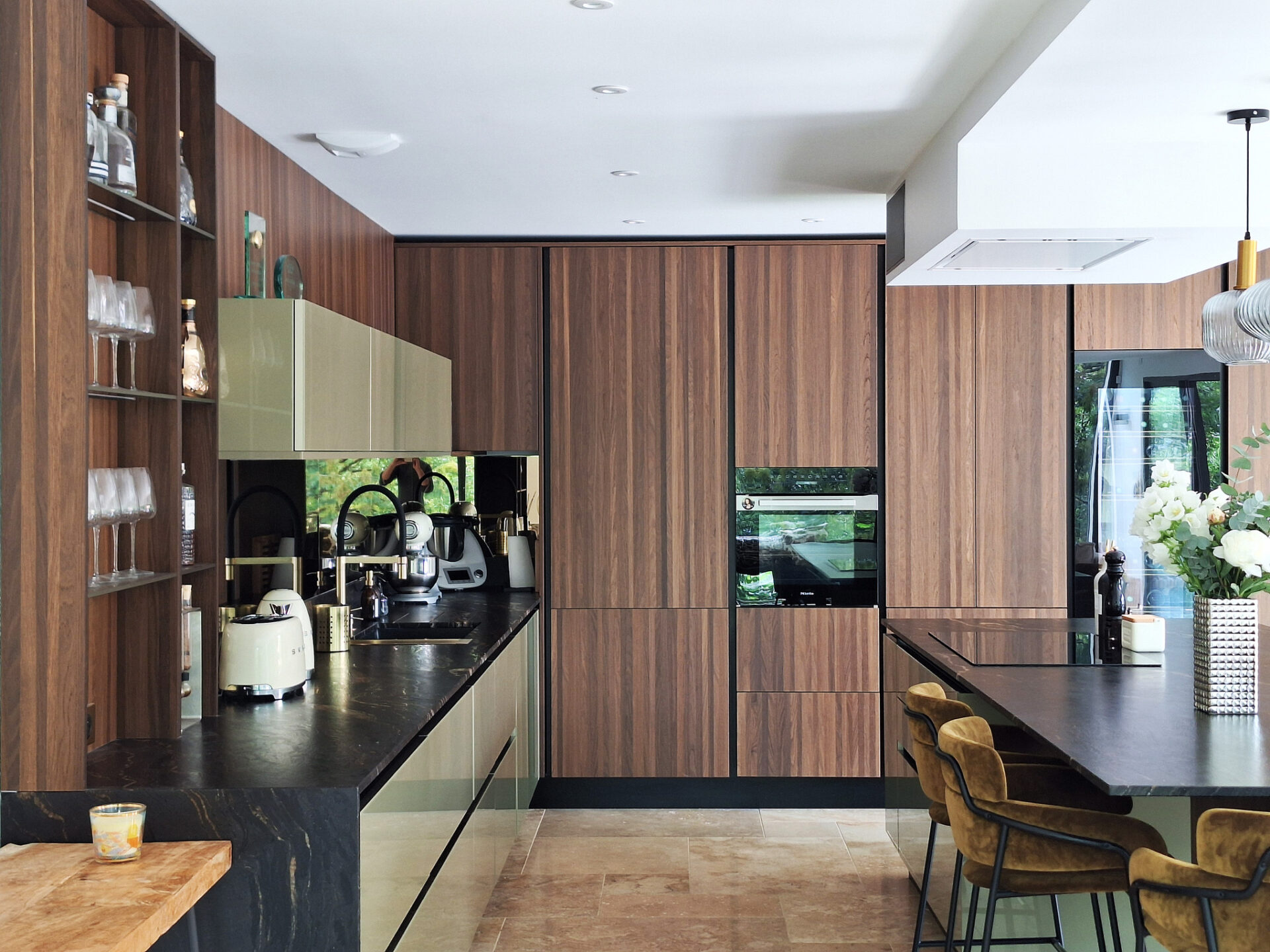 Nous avons sélectionné la gamme d’exception de Veneta Cucine avec ses matériaux rares comme ses façades laquées sans solvant au vert profond combiné aux façades en verre Riflex travaillé pour refléter la lumière combinée au placage bois appelé Rovere Botte mêlant nuances chaudes et accents profonds et naturel.