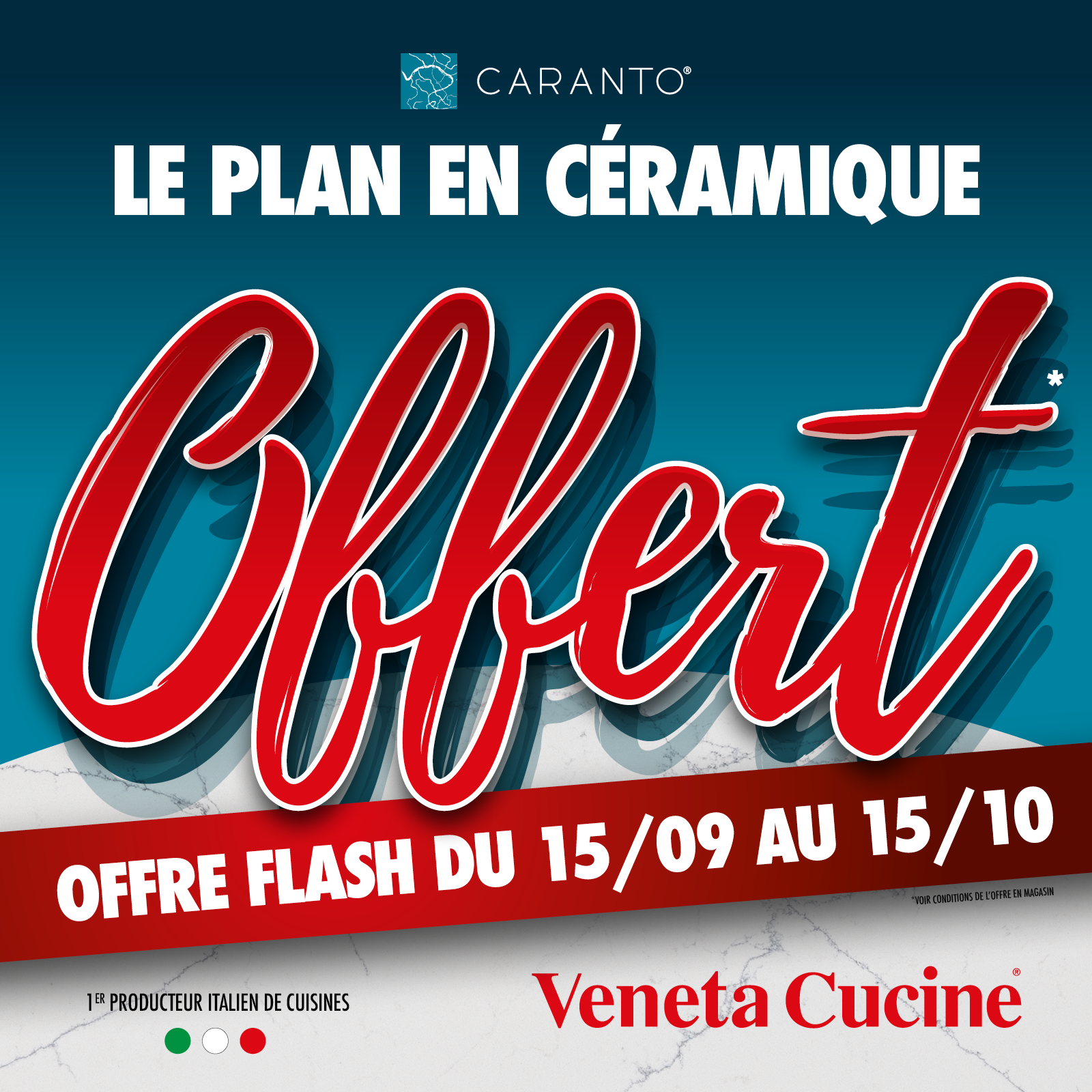 *Pour tout achat d’une cuisine d’un montant minimum de 9 900 € HT meubles uniquement, (hors éco-participation, crédences, jambages, électroménager, sanitaires, pose et livraison), nous vous offrons un plan de travail en céramique de la marque Caranto, disponible en toutes épaisseurs. Cette offre est réservée aux particuliers et est valable uniquement dans les magasins participants Veneta Cucine en France, du 15 septembre 2025 au 15 octobre 2025. Elle ne peut être cumulée avec d’autres promotions en cours ou à venir. Photo non contractuelle, à titre illustratif de la gamme.